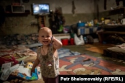 В подвале постоянно работает телевизор, на полу лежат коврики - обитатели бомбоубежища в Петровском районе Донецка наводят уют, как могут. Постоянно здесь живет 19 детей и столько же взрослых. У Светы две дочки и сын Кирилл - весной ему исполнился год.