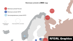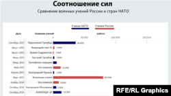 В инфографике Радио Свобода приведены недавние военные учения обеих сторон и указан их масштаб: