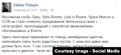 "Московские клубы не cтали отменять празднование Хеллоуина. Некоторые переживают по поводу замайданных идиотов, написавших сорок тысяч радостных постов. У нас соотечественники, милые буржуазные мальчики и девочки, такое же зверье. Клубы, конечно же, должны называться иностранными буковками. Они там и живут – в своем джипси спайсе. И у меня будет личный праздник, когда жизнь здесь будет совсем другая. "Ой, а почему это в нашем любимом клубе теперь кружок юных техников и починка коньков".