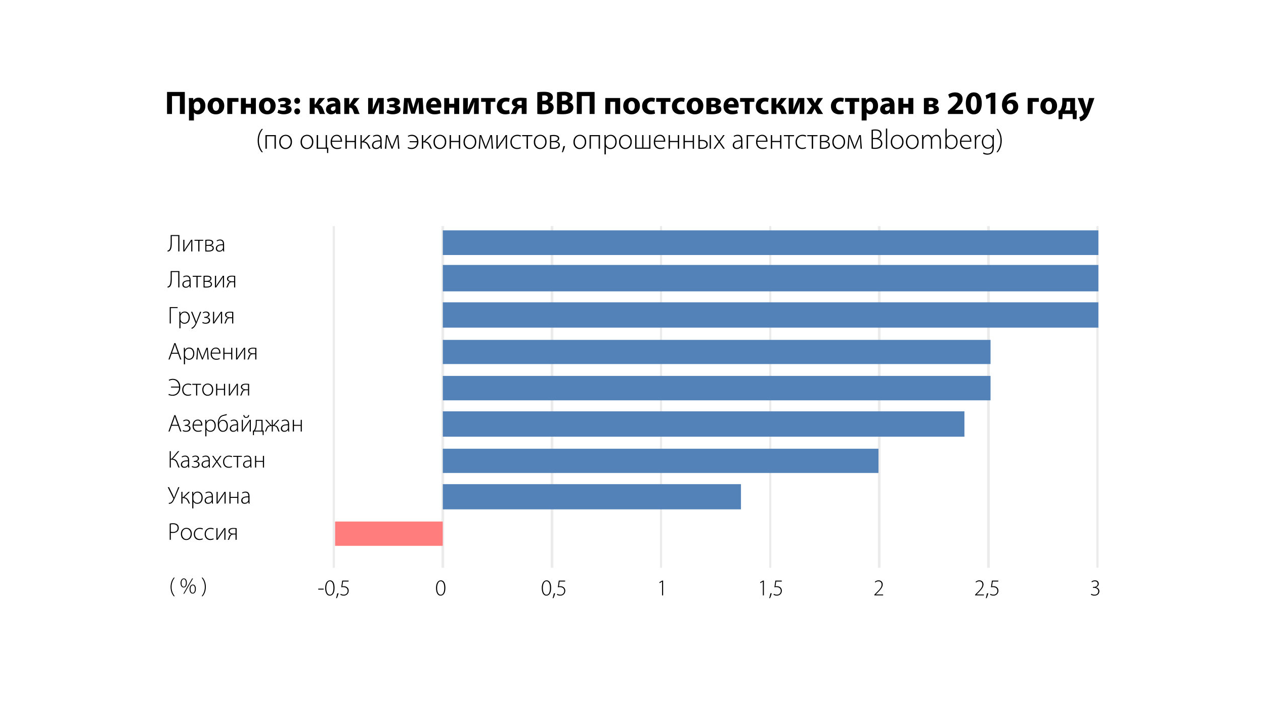 Что касается стран бывшего СССР, то по итогам 2015 года один из наихудших результатов показала Украина, занявшая предпоследнее место: ее ВВП по итогам года упал на 13%. Однако в 2016 году, по оценке экономистов, ВВП страны вырастет на 1,2-1,4%. Литву и Латвию и Грузию ждет рост ВВП примерно на 3%, Азербайджан – на 2,4%, Армении и Эстонии – на 2,5%, Казахстана – на 2%.
