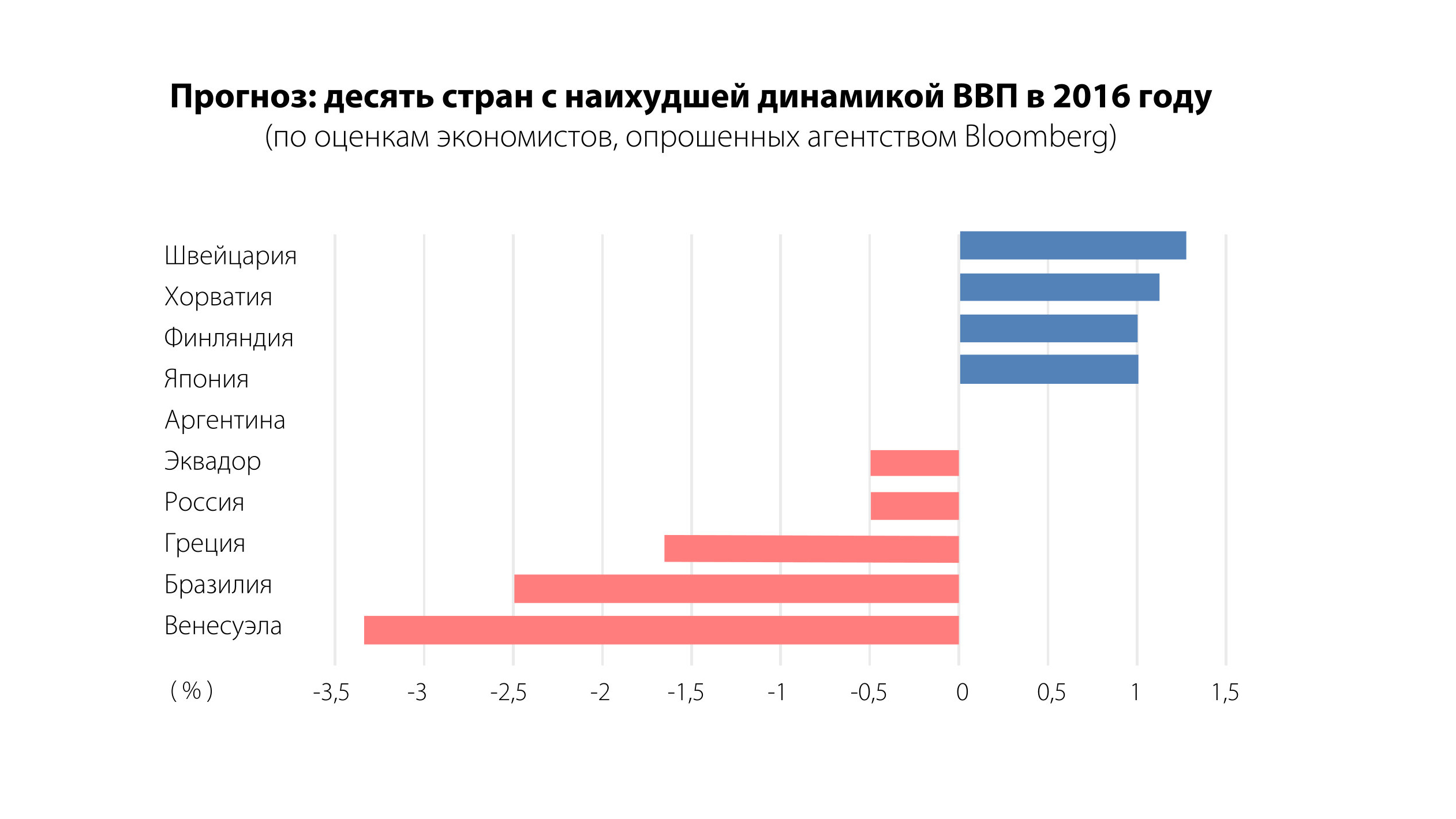 От санкций, наложенных на Россию, в 2015 году пострадают также экономика Финляндии, которой Bloomberg также в 2016 году предрекает рецессию: страна по темпам роста войдет в десятку худших. Также снижение ВВП ждет Швейцарию – из-за того, что Центробанк этой страны решил "уронить" сверхдорогой швейцарский франк, Хорватию и Японию. А наибольшие темпы роста в 2016 году ждут экономику Индии – Bloomberg оценивает их в 7,4%.
