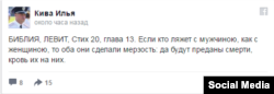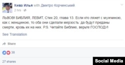 "ЛЬВОВ! БИБЛИЯ, ЛЕВИТ, Стих 20, глава 13. Если кто ляжет с мужчиною, как с женщиною, то оба они сделали мерзость: да будут преданы смерти, кровь их на них. P.S. Читайте Библию, верьте ГОСПОДУ!", – написал Илья Кива в своем фейсбуке.