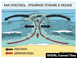 Потоки, которые чаще всего называются rip current или "тягун" (высокие волны – это верный признак отсутствия "тягуна", пена – явное подтверждение обратного течения), уносят пловца далеко от берега.