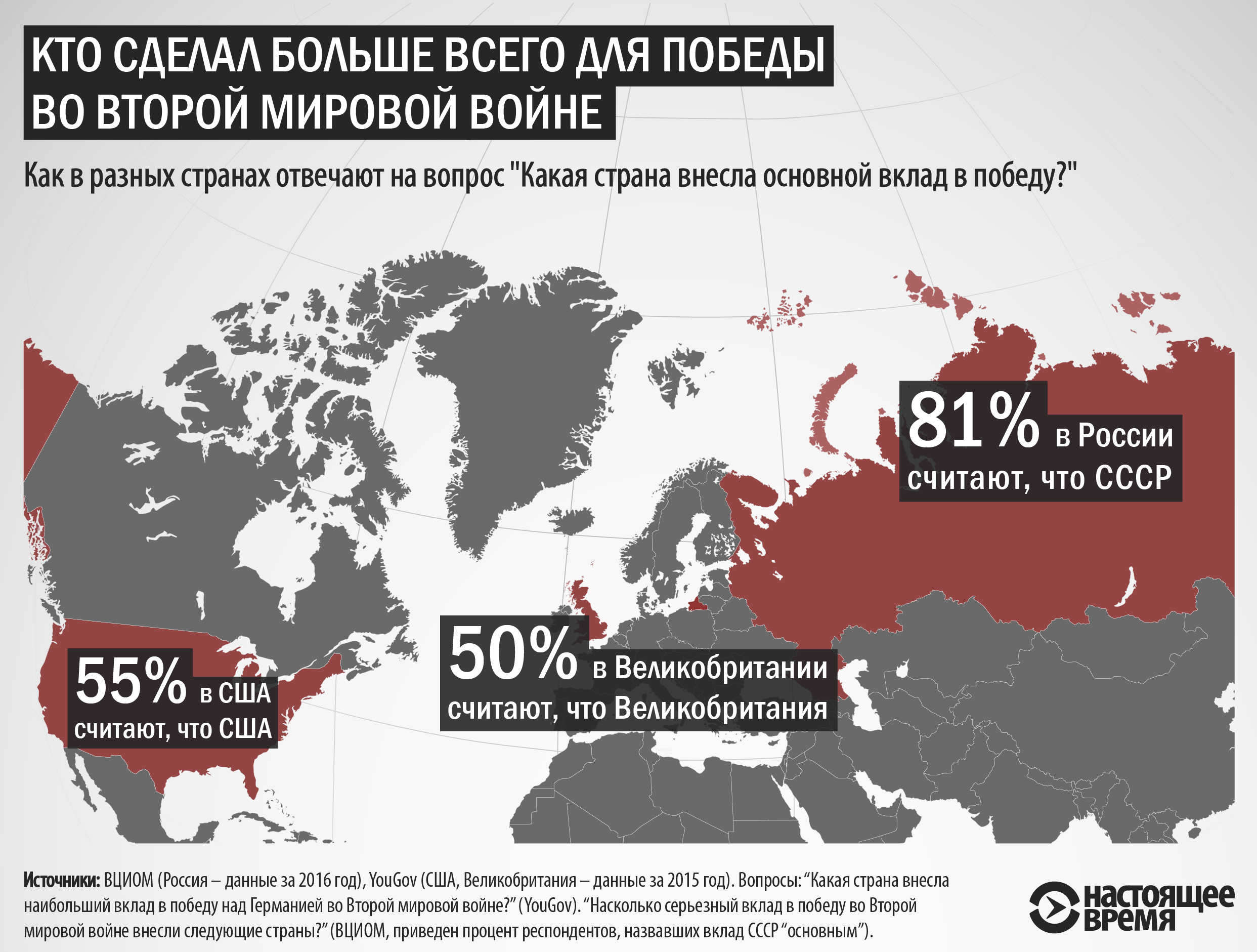 Разные страны по-разному оценивают свою роль в победе над фашизмом. Что на этот счет думают бывшие антигитлеровские союзники: Россия, Великобритании и США?