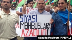 "Мы собрались сегодня здесь для того чтобы объявить бойкот этому референдуму. Для чего нужен этот референдум? Для того чтобы в третий раз изменить конституцию ради одного человека - Ильхама Алиева", - скандировали участники митинга.