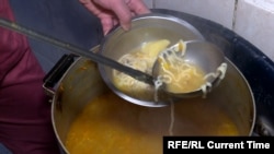 "На первое – лапша с мясом, на второе – молочная каша и яйцо. Хлеб, чай с сахаром", – рассказывает повар приюта для бездомных "Коломто" Бегаим Ишенбаева.
