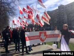 Демонстрантам удалось организовать колонну с бело-красно-белыми флагами. Они идут в сторону центра города