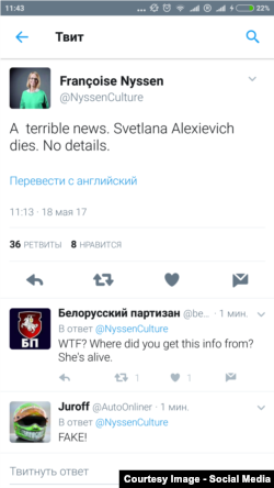 Примерно через 40 минут после публикации записи о смерти Алексиевич в твиттере Франсуазы Ниссен там же появился пост о том, что аккаунт является фейковым.