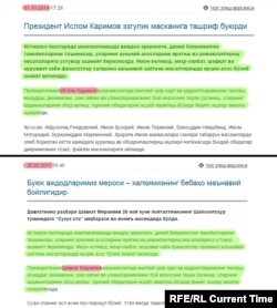 Между текстами выше – почти три года разницы. Первая статья – о визите Ислама Каримова в Ферганскую область и о "последовательном развитии экономики" региона. Во второй описывается приезд Шавката Мирзиёева в Сырдарью и о "стабильных шагах развития экономики" в этой области.