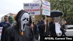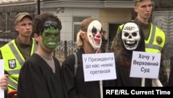 "По моей информации, некоторые из этих недобропорядочных судей дали взятки в размере от 200 до 500 тысяч долларов для того, чтобы попасть в Верховный суд, – объясняет один из участников акции. – И я символизирую такого судью, который считает, что у него есть прикрытие в высших эшелонах власти".