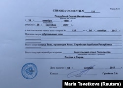Reuters показывает справку о смерти, выданную родственникам Сергея Поддубного, сотрудника частной военной компании, который 28 сентября погиб в городе Тиас, провинция Хомс.