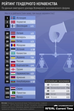 Средний показатель гендерного неравенства по миру проходит между Мальтой (93 место с показателем 0,682) и Грузией (94 место с показателем 0,679). Россия находится выше этой линии, тогда как Армения и Азербайджан – ниже.