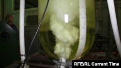 С помощью сложных химических реакций 50 тонн жидкого металла сначала превращают в полторы сотни литров экстракта, потом – в два литра, а потом в стакан прозрачного раствора. Его заливают в специальную стеклянную установку, где раствор проходит многоступенчатую очистку от примесей с помощью вымораживания на различных ловушках, с помощью жидкого азота, с помощью прогрева на титановой, на железной, на углеродной стружке. "И только потом он попадает в разные ловушки и попадает в высоко-чистую вакуумную часть установки", – перечисляет она.