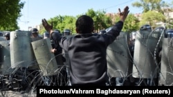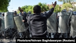 Лидером протеста является глава оппозиционной партии "Елк" Никол Пашинян. Утром во вторник он снова призвал своих сторонников заблокировать подходы к зданию парламента и перекрыть центральные улицы города: