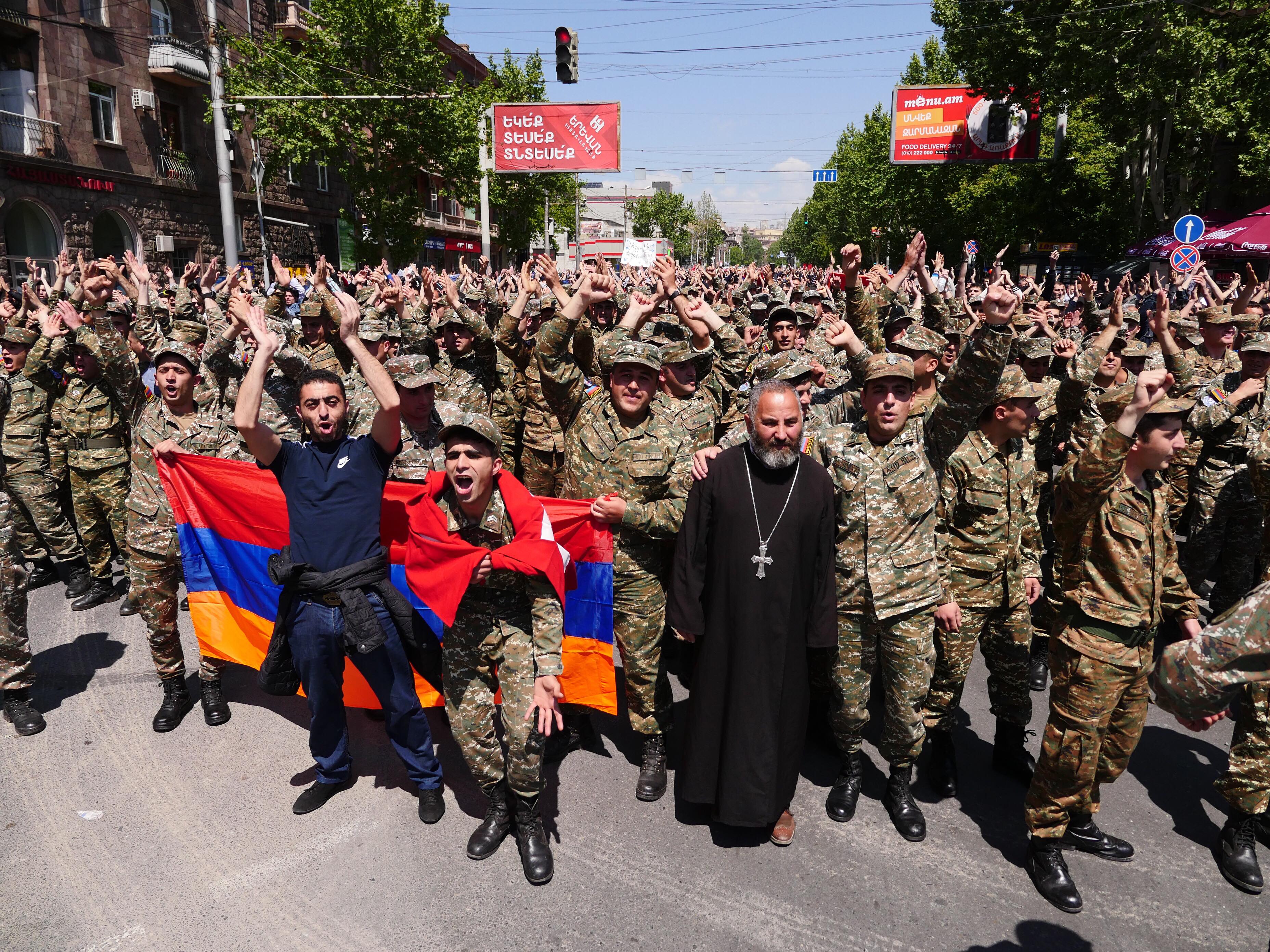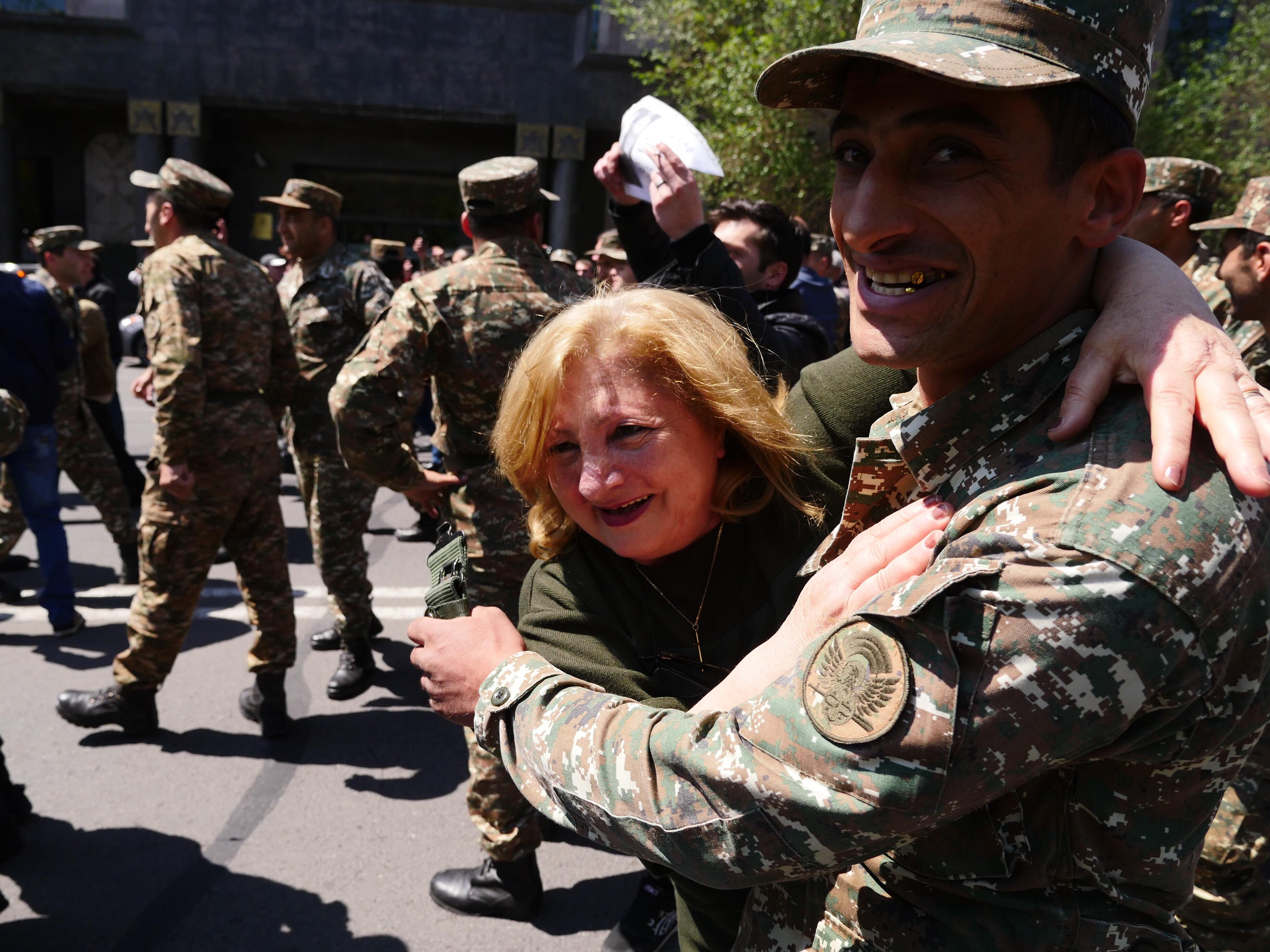 В понедельник, 23 апреля, на улицы вновь вышли с демонстрациями студенты, но на этот раз помимо обычных жителей к ним присоединились военные и ветераны. Вскоре после первых сообщений Министерство обороны Армении осудило это решение и обещало принять меры в отношении служащих, которые "самовольно" покинули воинские части. Что будет с ними после отставки премьера, как и с задержанными, пока неизвестно.