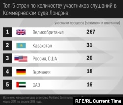 Статистику о делах с участием россиян в Коммерческом суде Лондона (подразделение Высокого суда) ежегодно публикует консалтинговое агентство Portland Communications. Последние годы Россия стабильно занимает второе-третье место, соревнуясь по количеству заявителей с США и Казахстаном. Первое место пока остается за британцами, но их доля колеблется от 28 до 40%.