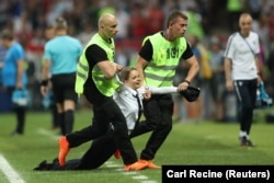 Четверо участников Pussy Riot выбежали на поле во время финального матча Чемпионата мира по футболу между сборными Франции и Хорватии. Они сделали это в рамках акции "Милиционер вступает в игру".