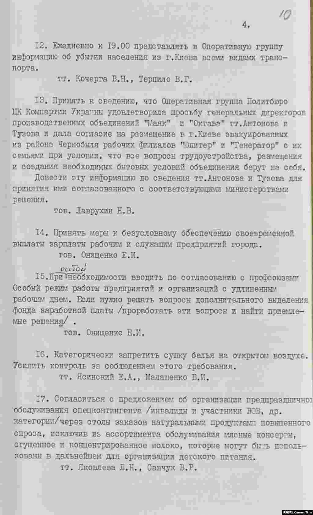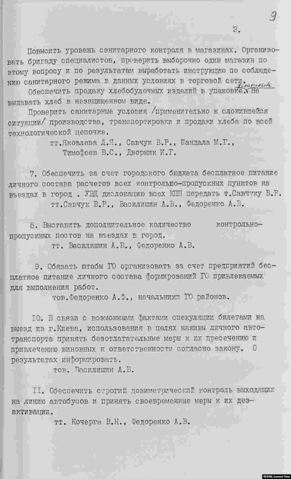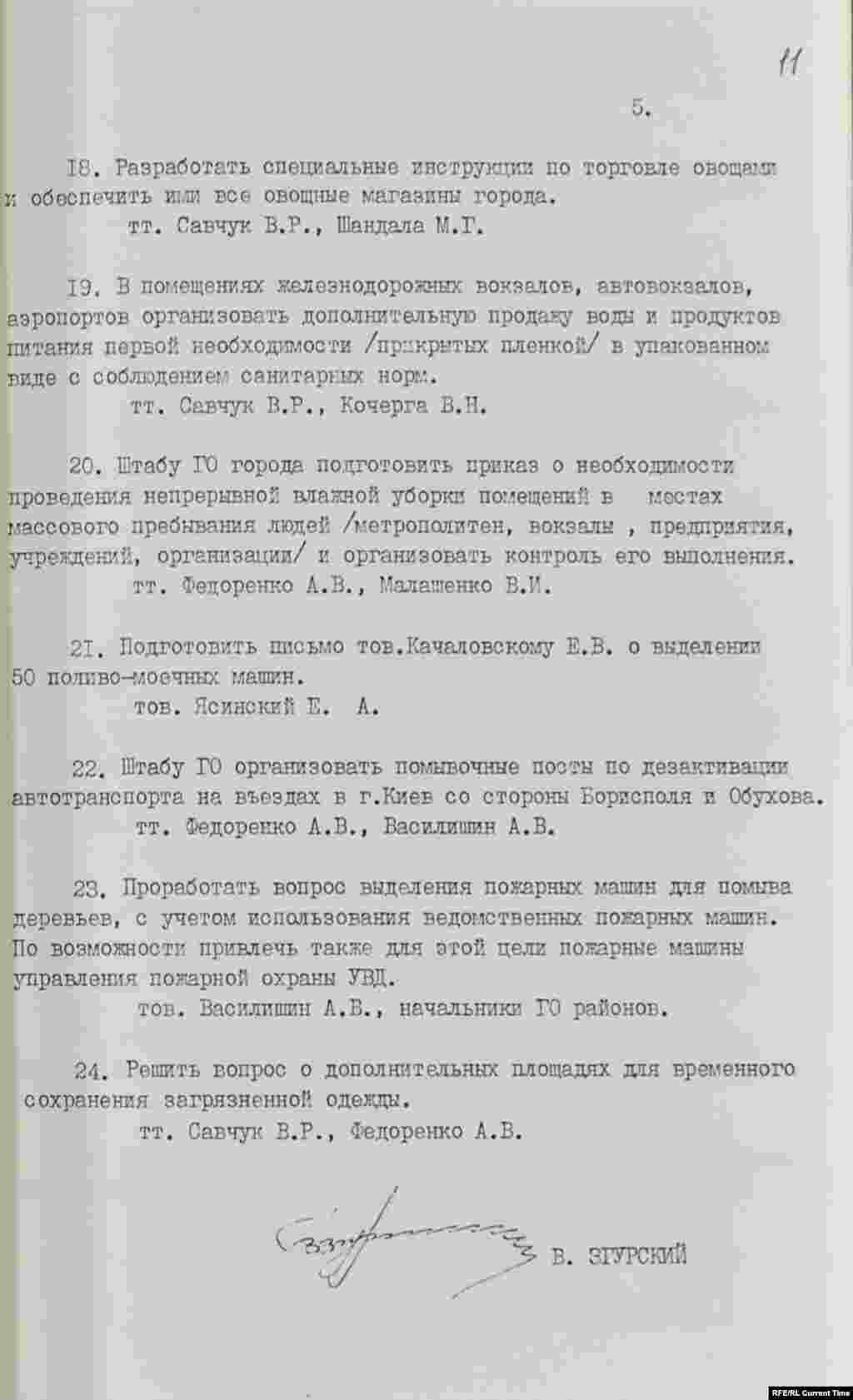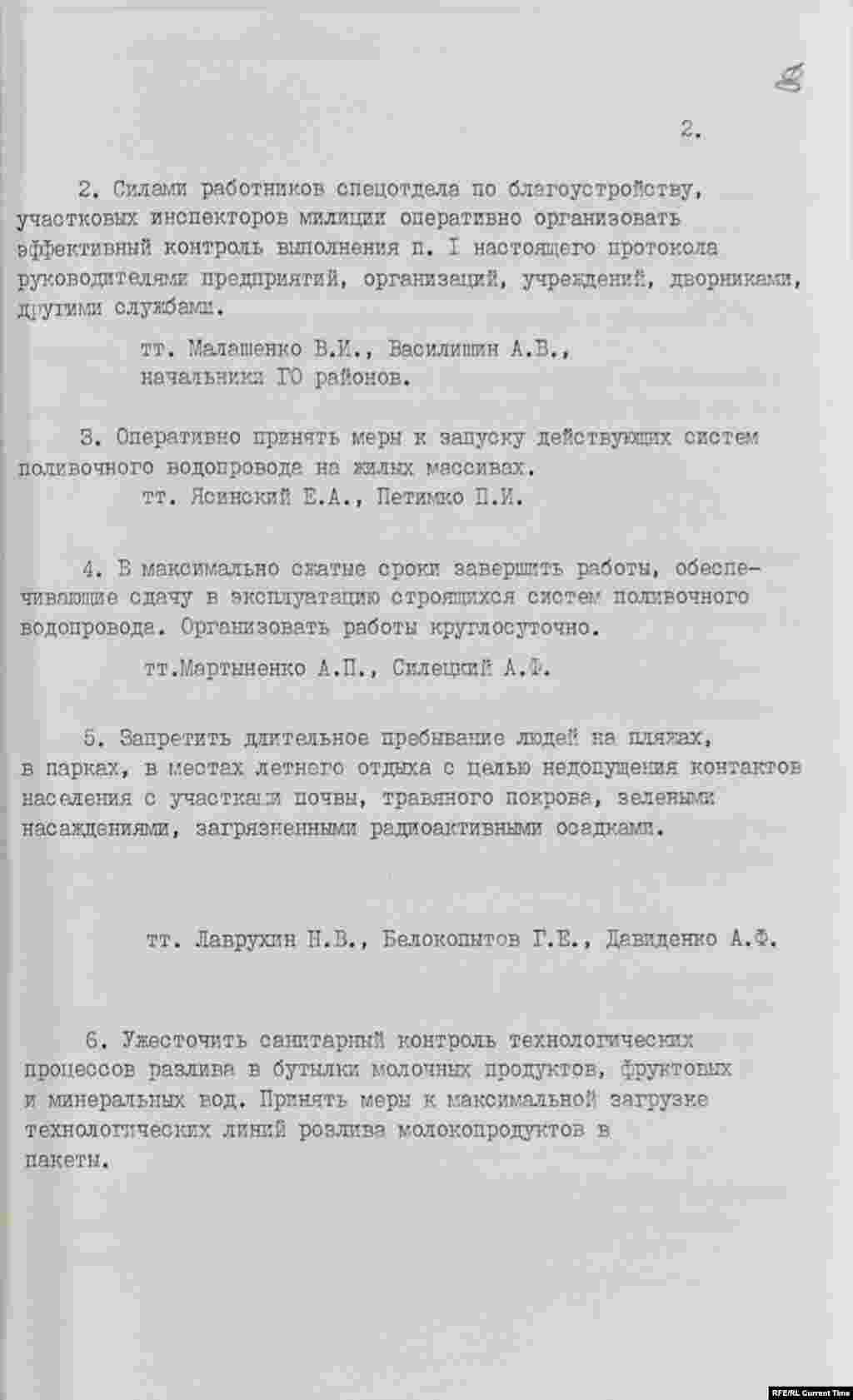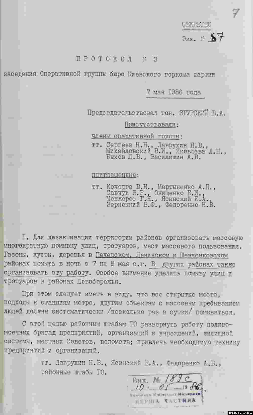 "Для дезактивации территории районов организовать массовую многократную помывку улиц, тротуаров, мест массового пользования. Газоны, кусты, деревья в Печерском, Ленинском и Шевченковском районах помыть в ночь с 7 на 8 мая. В других районах также организовать эту работу. Особое внимание уделить помыву улиц и тротуаров в районах Левобережья"