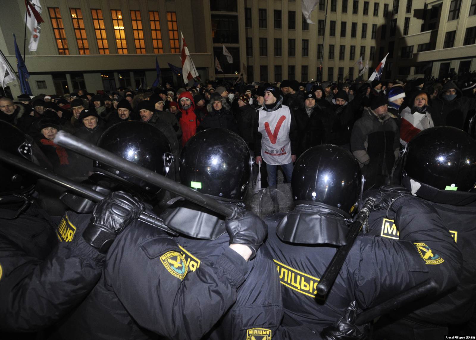 В ночь на 20 декабря около 30 тысяч несогласных с объявленными результатами выборов вышли на акцию протеста, но ОМОН жестко их разогнал. Были задержаны сотни человек, в том числе семеро из девяти альтернативных кандидатов в президенты. На следующее утро и в течение месяца по всей стране шли обыски у правозащитников, активистов, а также в редакциях "Еврорадио", изданий "Наша Нива", "Белсат". По делу об организации массовых беспорядков или участии в них проходили 54 человека, сотни отбывали административный арест.