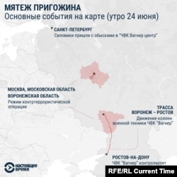 Власти России подтвердили, что в России произошел "вооруженный мятеж". Так они назвали действия военных российской "ЧВК Вагнер", которые вечером 23 июня пересекли границу РФ с оккупированной Луганской областью Украины и вошли в Ростов-на-Дону, окружив основные административные здания. Владимир Путин в утреннем обращении назвал происходящее "изменой", "мятежом" и "ударом в спину":