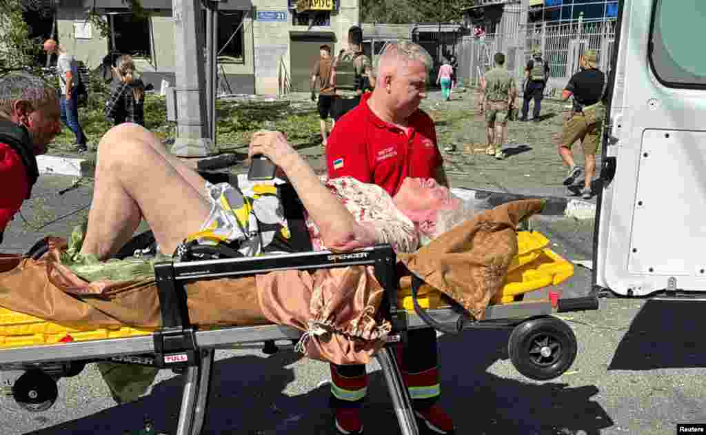 Медики оказывают помощь пострадавшей во время российского обстрела жительнице многоэтажки в Харькове, фото Reuters