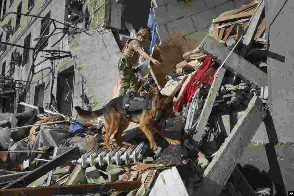 Специалист по взрывотехнике работает вблизи разрушенного жилого дома после российского удара по центру Харькова, фото AFP
