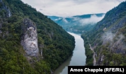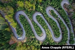 Грузовики едут по крутой горной дороге недалеко от Брашова, городка в в Южных Карпатах.