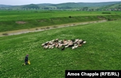 Пастух на пастбище вдоль реки Альбести на востоке Румынии.