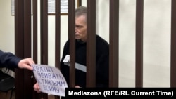 После приговора Горинов достал плакат с надписью "Хватит убивать, остановите войну".