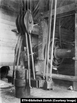 Внутри вышки для добычи нефти в Баку, фотография 1912 года: