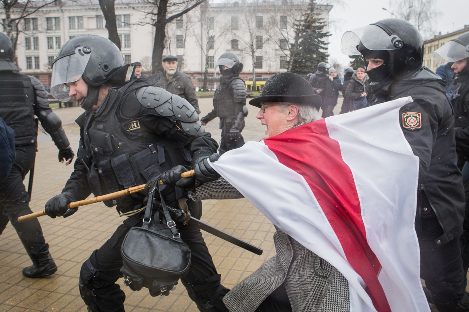 Он говорит о фото, после которого пожилая жительница Минска Нина Багинская "проснулась знаменитой" — по крайней мере, в активистской среде: хрупкая женщина в шляпке стоит перед отрядом милиции, держа в руке бело-красно-белый флаг. Этот снимок фотограф Евгений Отцецкий сделал в 2006 году на акции, посвященной Дню воли — так называют День независимости Беларуси, который многие жители страны отмечают 25 марта (государственным праздником он не считается).
