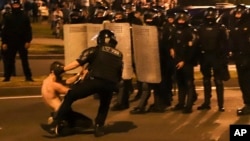 По версии МВД, в Минске в 22:00 в районе стелы "Минск – город-герой" "протестующие зажигали фаеры, разбрасывали на проезжую часть шипы, гвозди, сооружали баррикады из мобильных турникетов, разбирали тротуарную плитку и забрасывали ею и иными предметами правоохранителей".