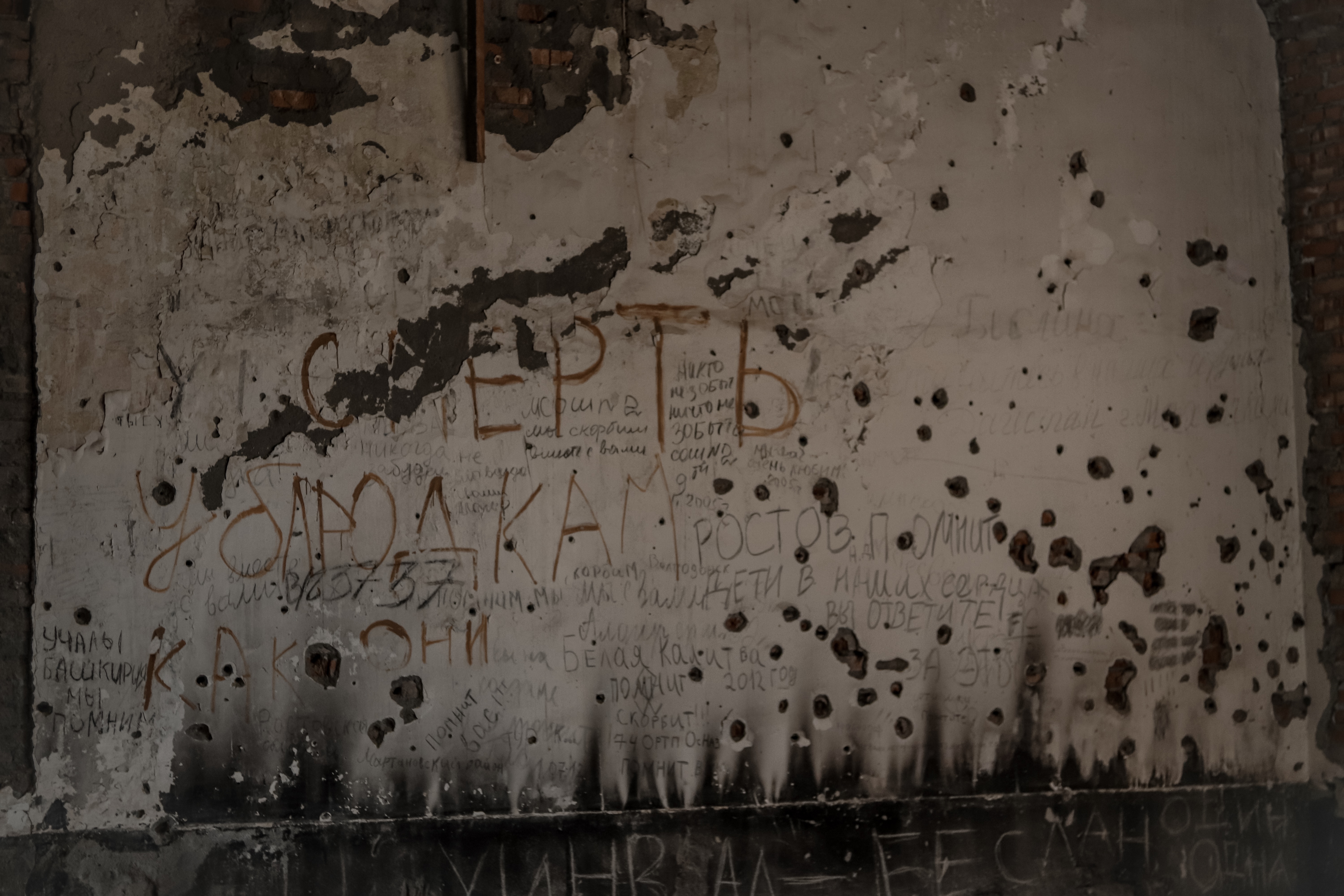 Надписи и пулевые отверстия на стене бывшей школы №1