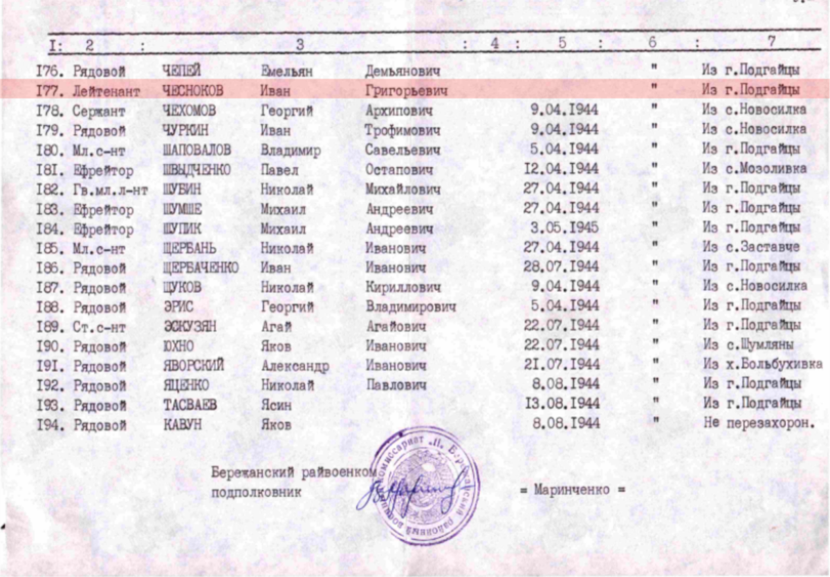 Подгаецкий журналист Григорий Жибак нашел место возможного захоронения убитого офицера МВД. Это братская могила погибших во Второй мировой на городском кладбище. Среди имен на стеле есть лейтенант Иван Григорьевич Чесноков. Скорее всего, это именно тот человек (хотя нельзя полностью исключать, что это может быть однофамилец).