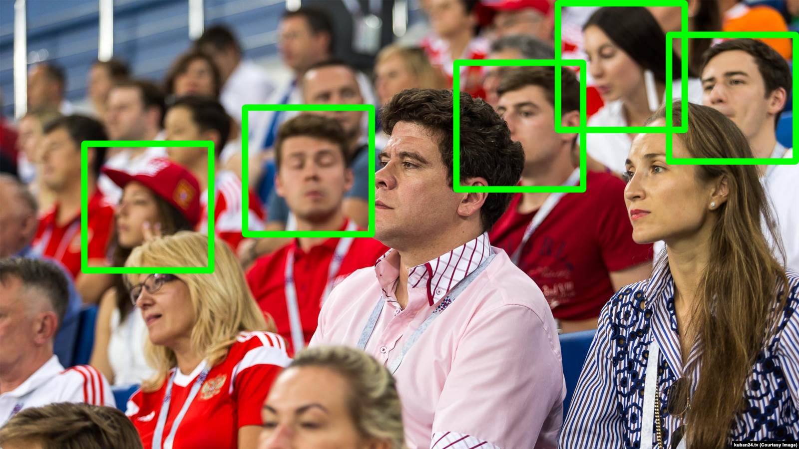 Зрители футбольного матча Россия – Хорватия, 2018 год. Выделены слева направо: Яна Григорян, Илья Медведев, Владимир Федотов, Кристина Хтей, Иван Коптенко