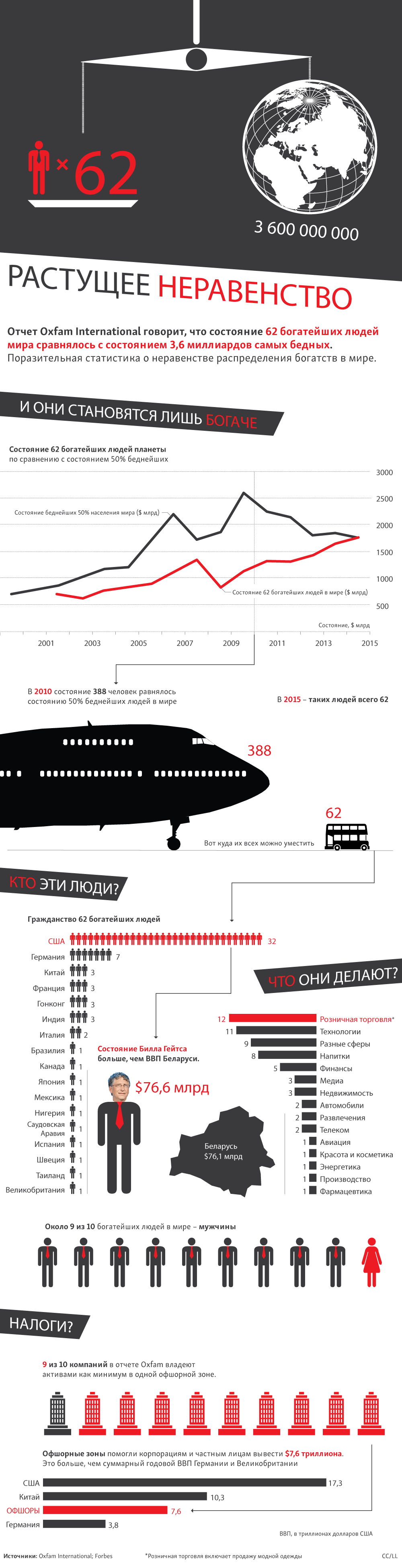 Отчет Oxfam International говорит, что состояние 62 богатейших людей мира сравнялось с состоянием 3,6 миллиардов самых бедных. Поразительная статистика о неравенстве распределения богатств в мире