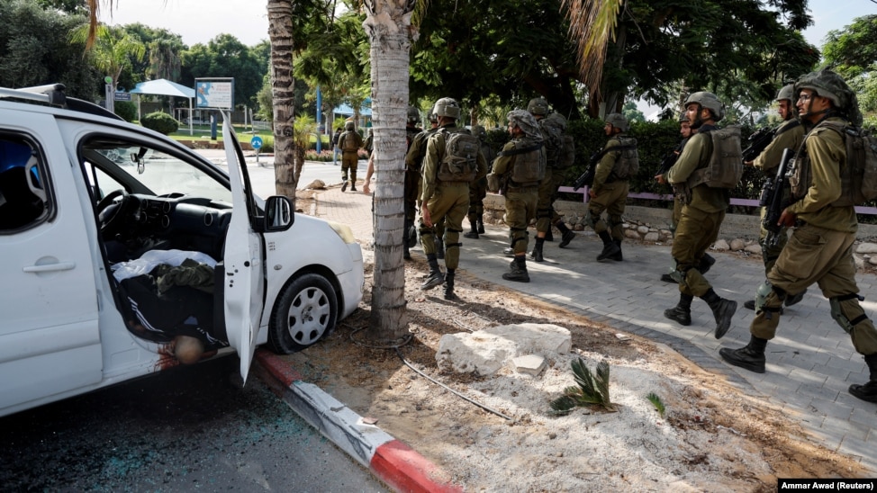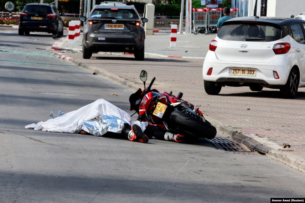 Тело автомобилиста лежит на дороге после массового проникновения боевиков ХАМАС из сектора Газа, в Сдерот на юге Израиля, 7 октября 2023 года