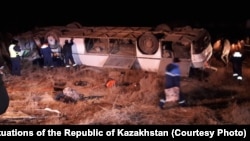 Сообщается, что в автобусе находились сотрудники нефтяной компании, которые ехали на работу на месторождение Кумколь. По предварительным данным властей, водитель из-за гололеда на скользкой дороге не сумел справиться с управлением.