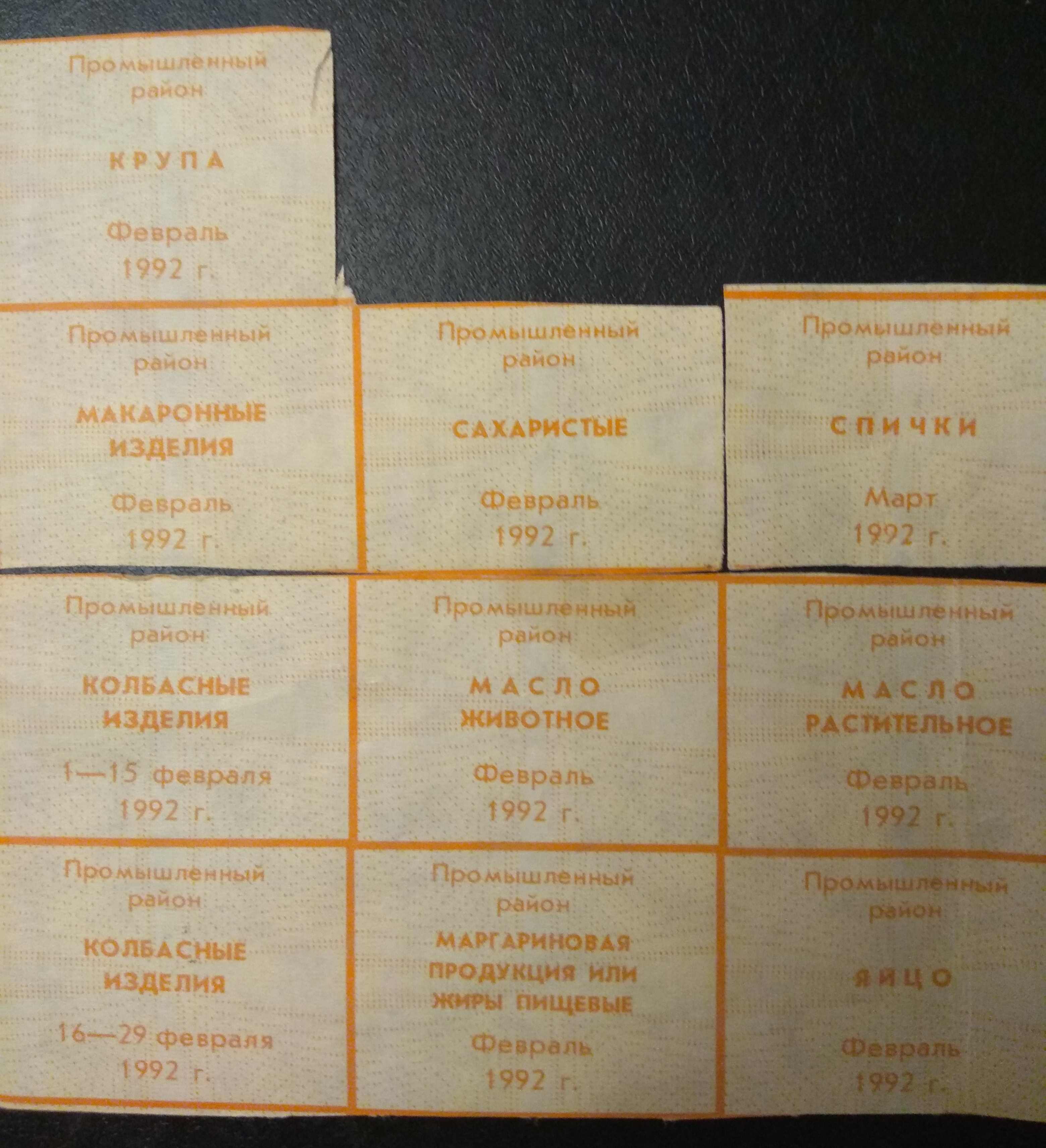 Талоны на продукты, выданные на февраль 1992 года в Промышленном районе Самары. Их использование стало бессмысленным после либерализации цен в начале 1992 года. Фото: Евгений Трещанин
