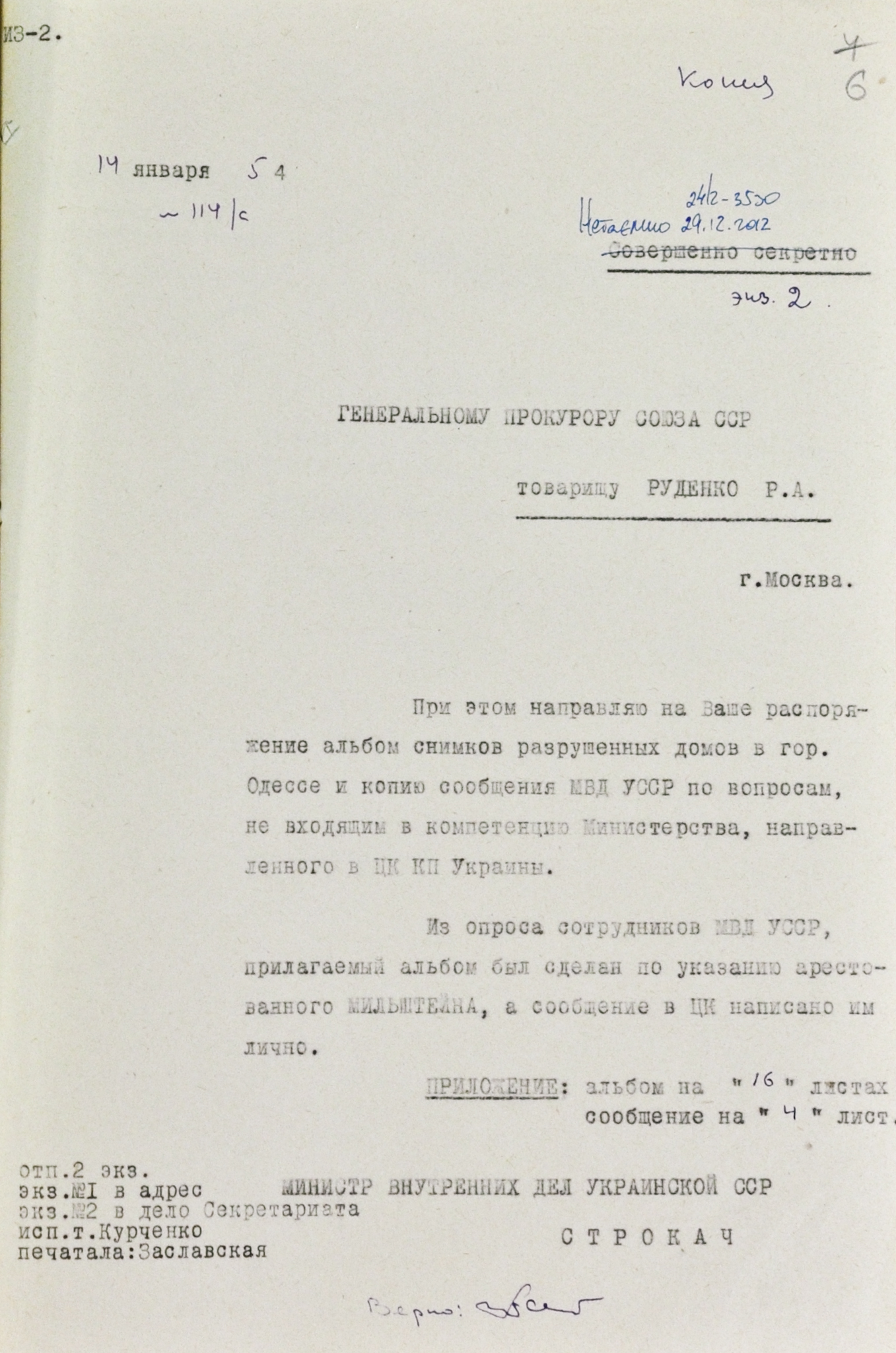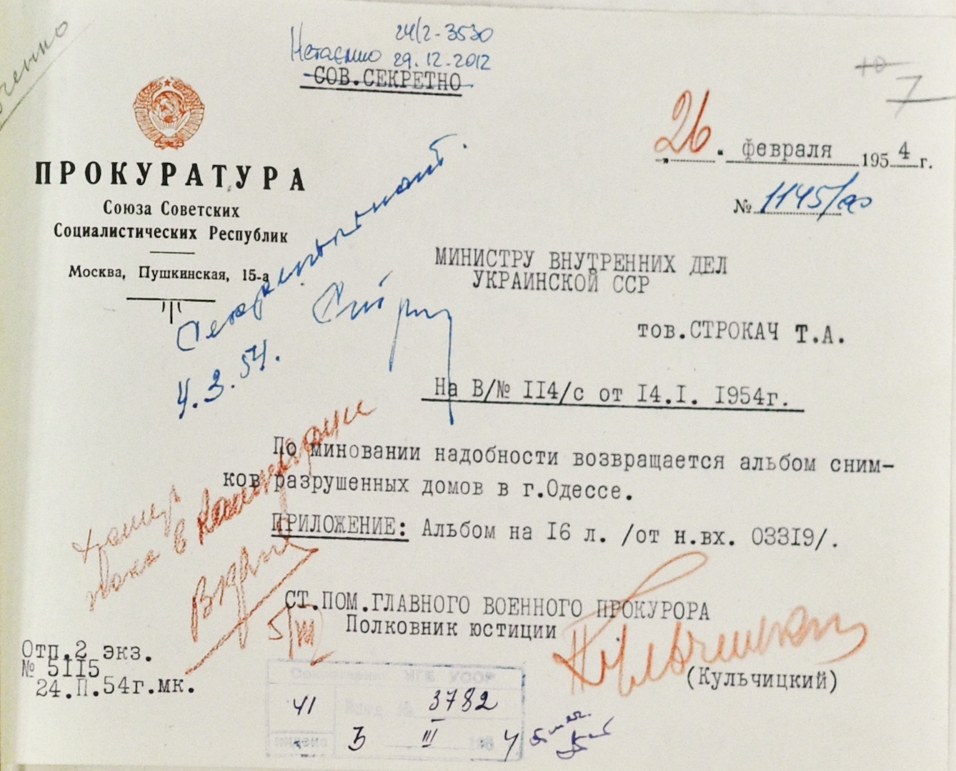 В январе 1954 года тот самый глава МВД Тимофей Строкач выслал альбом в Москву генпрокурору Роману Руденко, фактически возглавлявшему следственную группу по делу «банды Берии». В сопроводительной записке Строкач подчеркивает, что поднятые в одесских сообщениях вопросы не входят в компетенцию МВД. Вдохновителем затеи с альбомом глава ведомства называет именно Мильштейна.