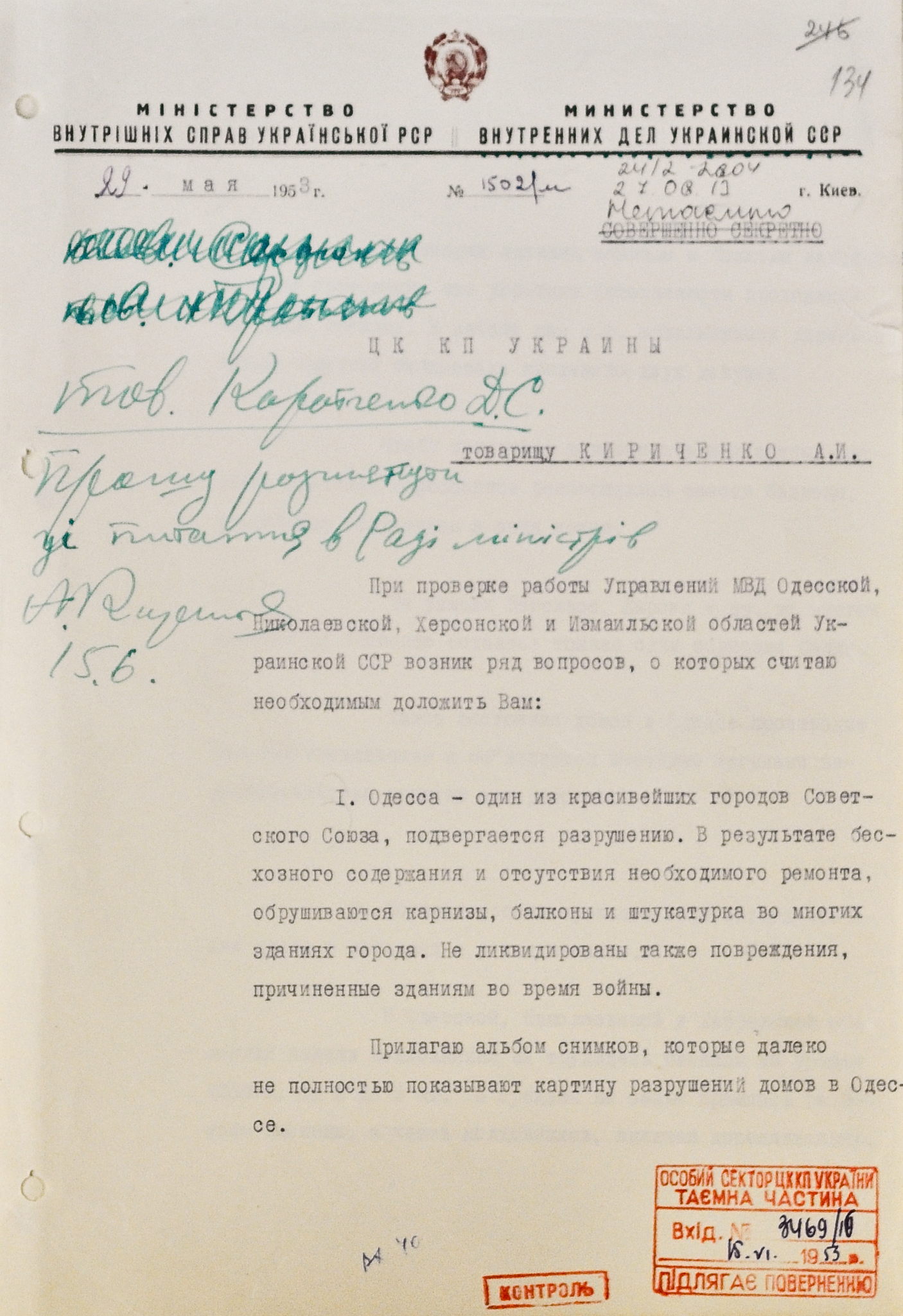 Альбом и пояснительную записку партийному начальству отправил в мае 1953 года Павел Мешик – глава созданного после смерти Сталина силового суперведомства, то есть одновременно и главный милиционер, и главный чекист Украины. Сам документ предположительно составил его заместитель Соломон Мильштейн. Чуть позже оба были расстреляны как сообщники Лаврентия Берии.