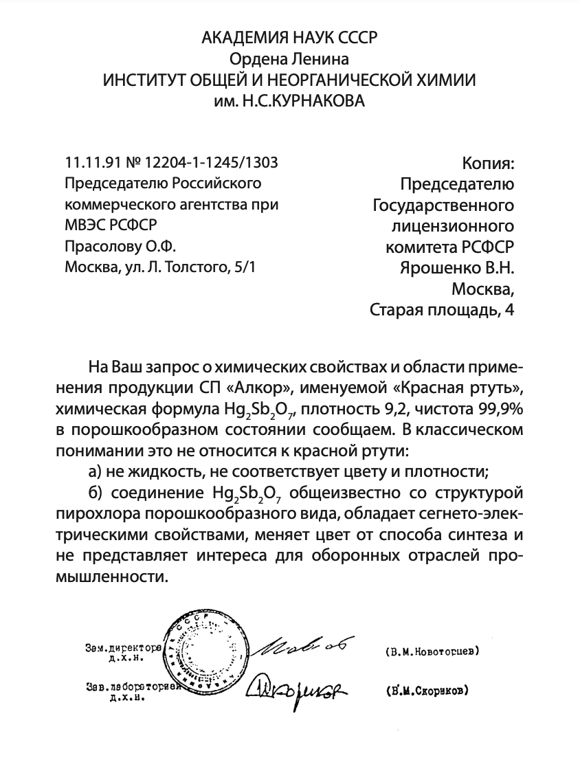 "В результате журналистского расследования выяснилось, что некоторые советские фирмы действительно выполняли заказы инофирм на изготовление красной ртути, – писали авторы материала. – [К ним] относится санкт-петербургское советско-американское СП "Алкор текнолоджиз инкорпорейтед", которое, по общепризнанным экспертным оценкам, ближе остальных подошло к схеме промышленного производства этого вещества".