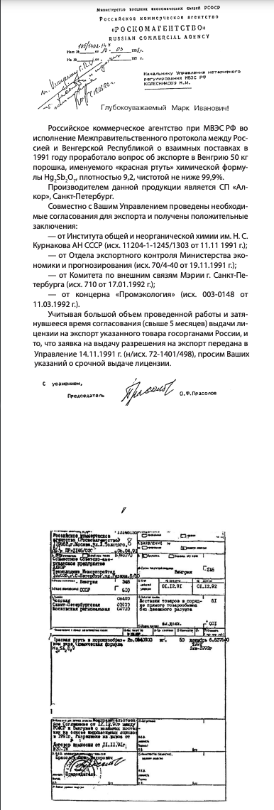 В ноябре 1991 года Олег Прасолов, председатель Роскомагентства при Министерстве внешнеэкономических связей РСФСР (орган, ответственный за выдачу квот), направил письмо председателю государственного лицензионного агентства. Прасолов писал, что "в соответствии с Межправительственным Протоколом от 14.06.91 о взаимном товарообороте между РСФСР и Венгерской Республикой" проработан вопрос о поставке в Венгрию 400 килограммов произведенной "Алкором" красной ртути на общую сумму в 30 миллионов долларов. Прасолов просил дать разрешение на вывоз КР в Венгрию и приложил к письму заключение Института общей и неорганической химии АН СССР (скрин).
