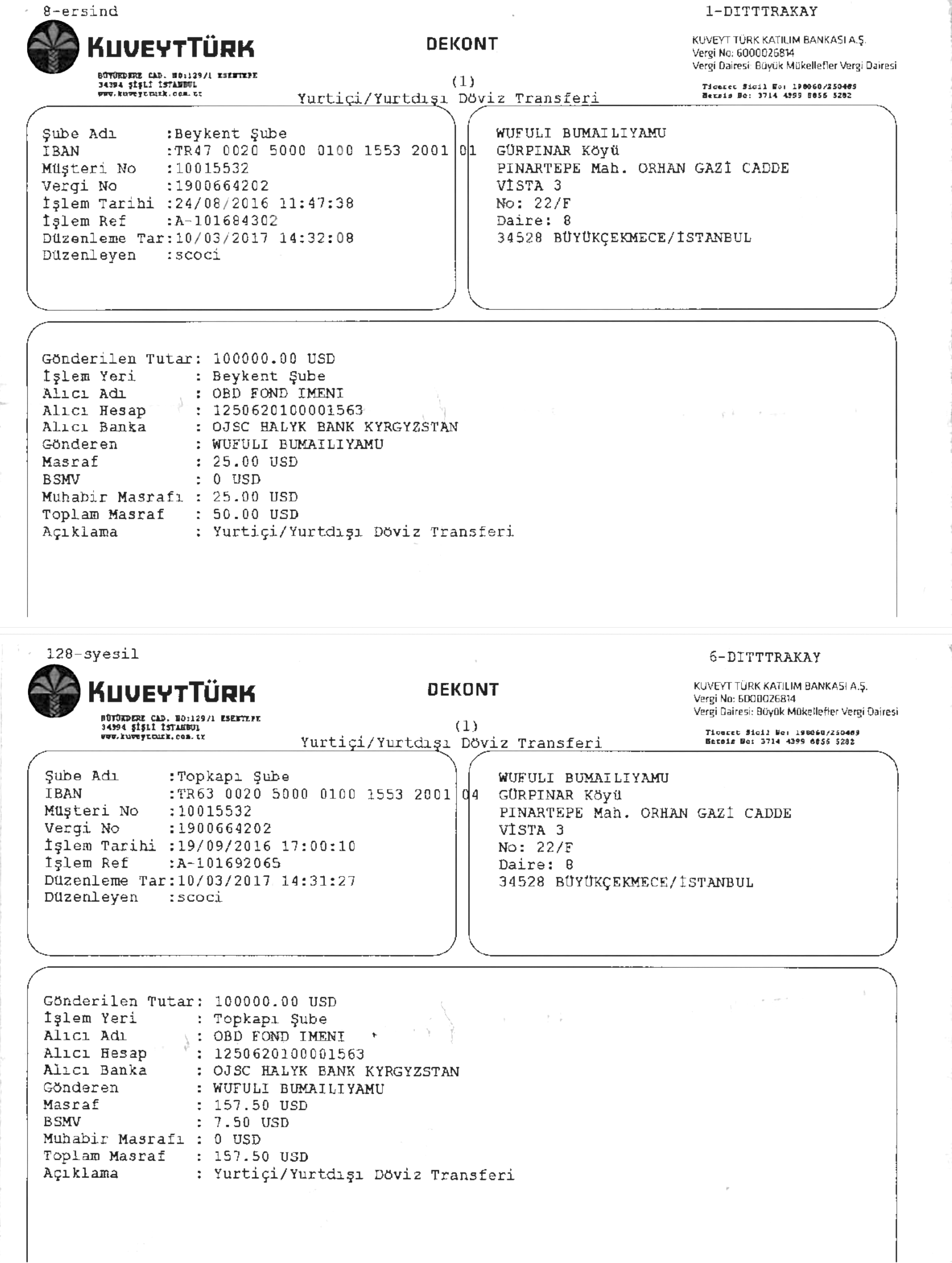 Платежные поручения для двух переводов по 100 тысяч долларов каждый от жены Саймаити Вуфули Бумайлияму на счет благотворительного фонда Матраимвых.