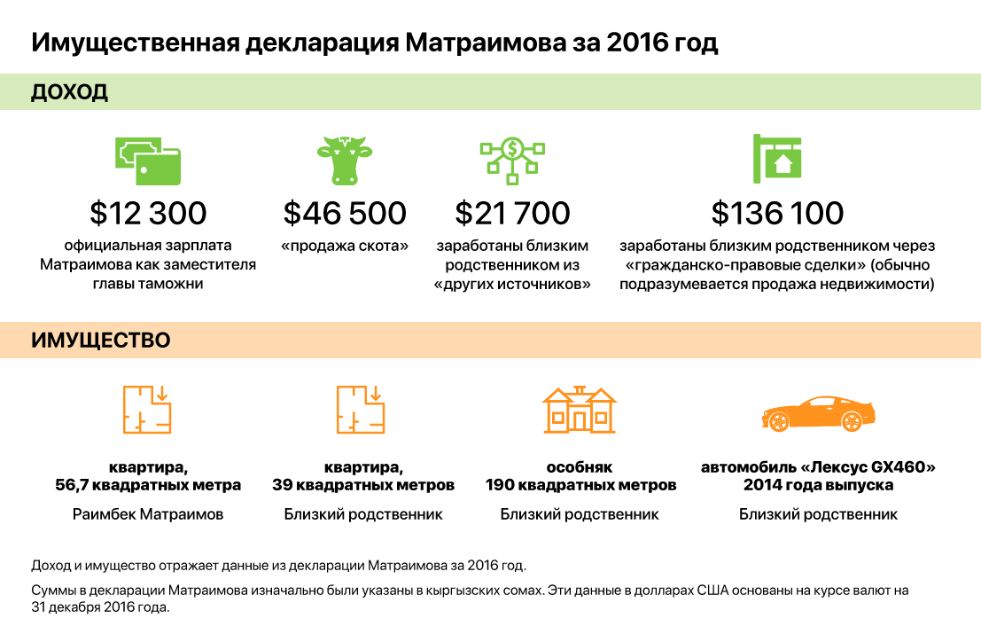 Несмотря на неоднократные запросы, Кыргызская государственная налоговая служба пока не предоставила декларации об имуществе Матраимова за 2017 год. Поскольку утечка не дает данных о точной дате покупки Тургуновой имущества, есть вероятность, что она совершила все эти приобретения в 2017 году, и они могли быть указаны в той декларации. Однако декларация Раимбека Матраимова за 2016-й показывает, что доход его семьи в том году составил чуть меньше 217 тысяч долларов, из которых лишь 12 530 долларов были его официальной зарплатой (остальное было из других источников). Его декларация за 2015 год и вовсе показывает годовую зарплату в 7739 долларов.