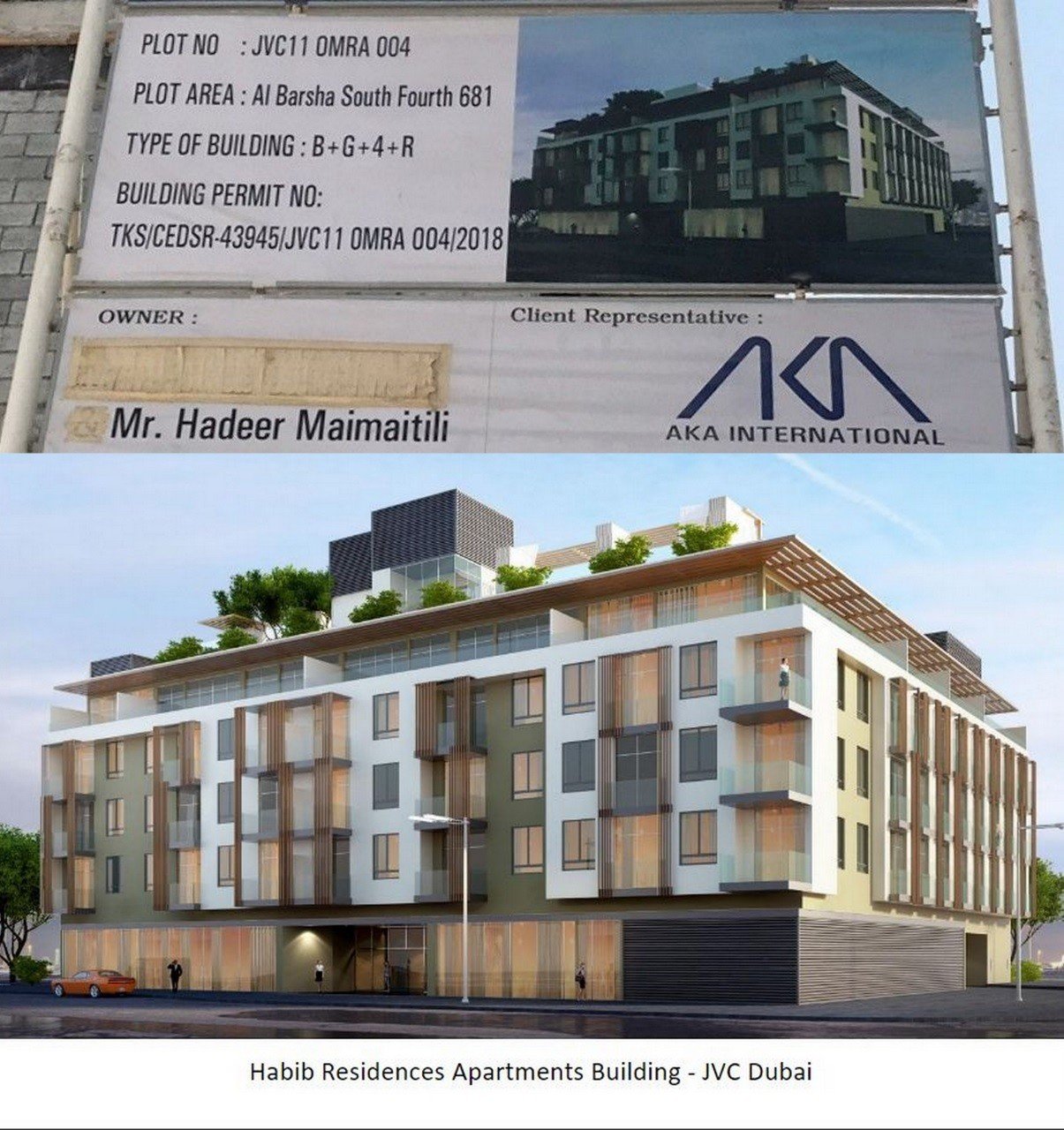 На стенде также показано, как будет выглядеть здание по окончании строительства. Внешне оно почти идентично зданию, указанному в резюме Александра Кармеинского, немецкого архитектора, который ранее строил другие здания для семьи Абдукадыр. В резюме Кармеинского объект носит название «Многоквартирное здание Habib Residences — JVC Dubai». Оно описывается как здание на 82 квартиры с магазинами на первом этаже и спортзалом, а также «с бассейнами на крыше, с которой открывается вид на новый торговый центр Jumeirah Village Circle».