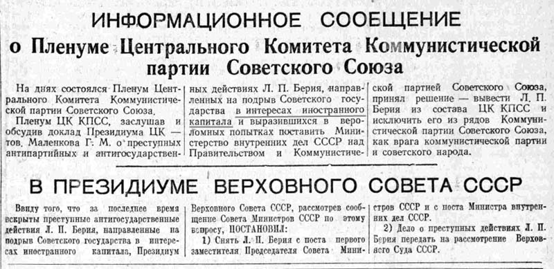 Сообщение газеты «Правда» о разоблачении Лаврентия Берии