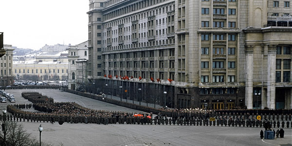 На одной из многочисленных пленок, снятых с балкона американского посольства, выходившего на Кремль, запечатлены пионеры, марширующие плотной колонной через Манежную площадь во время Первомайской демонстрации.