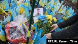 К импровизированному мемориалу в центре Киева постоянно приходят люди, кто-то вписывает новое имя на флажке, на бордюрах свежие цветы и лампадки.