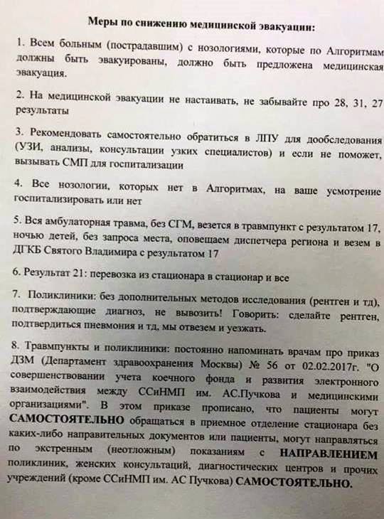 Распоряжения врачам "скорой" дают в устной форме, хотя на некоторых подстанциях они есть и в печатном виде, как "Меры по снижению медицинской эвакуации" – без печатей и подписей.